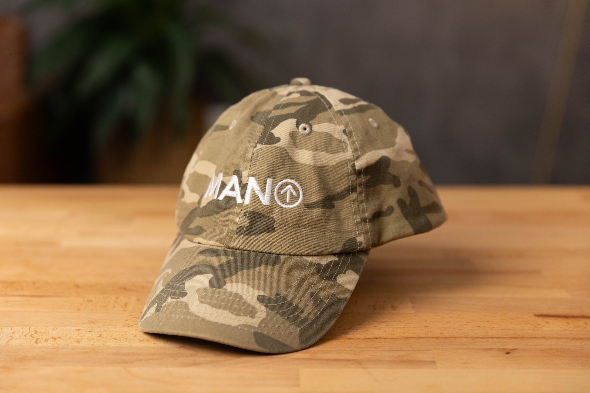 Tan camouflage dad hat with white embroidered MANUP logo.